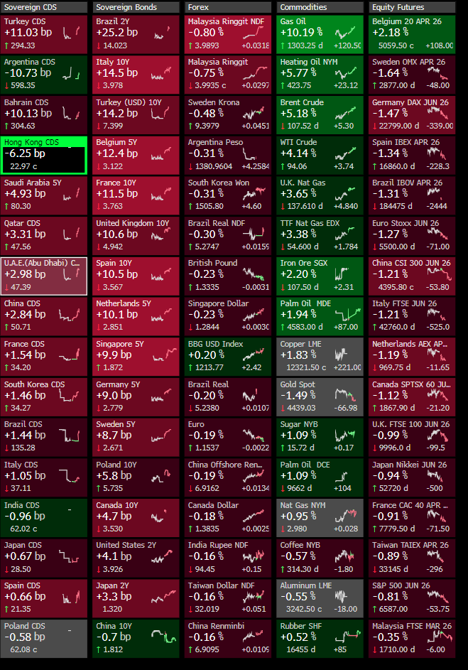 Asian markets closed sharply lower overnight. Hong Kong’s Hang Seng Index fell 1.9% to end at 24,856.43, snapping a two-day winning streak, while the Hang Seng China Enterprises Index decreased 2.3% to close at 8,389.93 . The biggest drags included Alibaba down 4.8% and Meituan down 5% . South Korea’s Kospi Index fell 3.2% to 5,460.46, with Samsung down 4.7% and SK Hynix down 2.5% on concerns over lower demand after Google researchers touted a new compression technique for large language models . Japan’s Nikkei 225 fell 0.27% to close at 53,603.65 . Singapore’s Straits Times fell 0.3% to 4,887.76 , Thailand’s SET Index fell 1% to 1,442.92 , and Malaysia’s KLCI Index shed 0.3% to 1,710.89 .